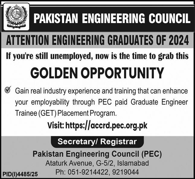 Both Male and Female candidates can apply for these Engineering Council Jobs who have the Qualification: Gain real industry experience and training that can enhance your employability through the PEC paid Graduate Engineer Trainee (GET) Placement Program. Many more experienced candidates should apply within 10 days.