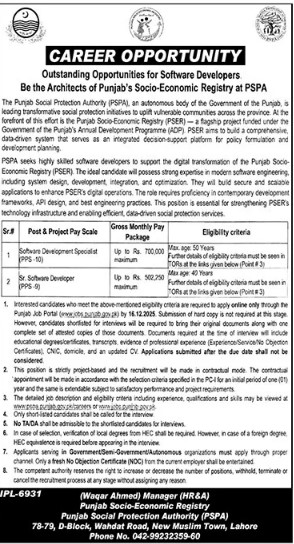 - PSPA seeks highly skilled software developers to support the digital transformation of the Punjab Socio-Economic Registry (PSER). The ideal candidate will possess strong expertise in modern software engineering, including system design, development, integration, and optimization.