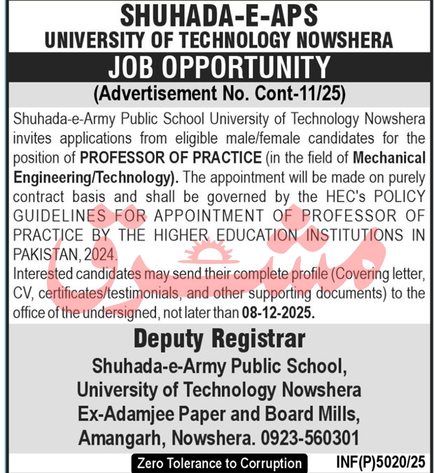 Candidates, if you are seeking Shuhada-e-APS University of Technology Jobs 2025 in Nowshera, yes. Then it would help if you tried to complete this Shuhada-e-APS University of Technology Jobs because here you can easily apply for this vacancy: Professor of Practice.