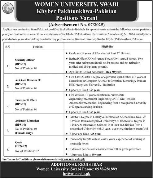 Candidates, if you are seeking Women University in KPK Jobs 2025, apply online. then it would help if you tried to complete this Women University In KPK Jobs because here you can easily apply for these vacancies: Security Officer (BPS-17) No. of Position: 01, Assistant Director IT (BPS-17) No. of Position: 01, Transport Officer (BPS-17) No. of Position: 01, Assistant Librarian (BPS-16) No. of Position: 02 (Female Only), and Cook (BPS-02) No. of Position: 02.
